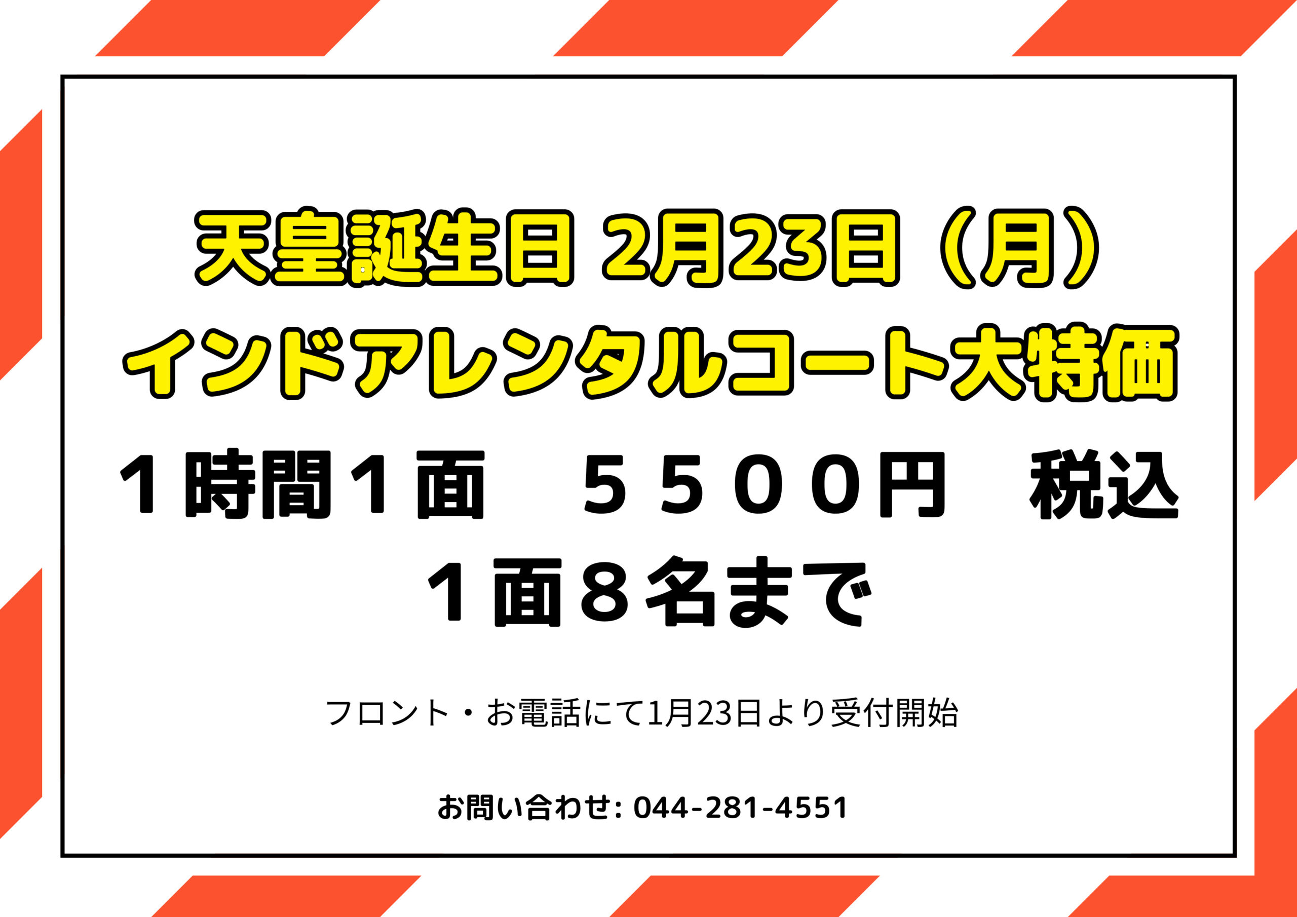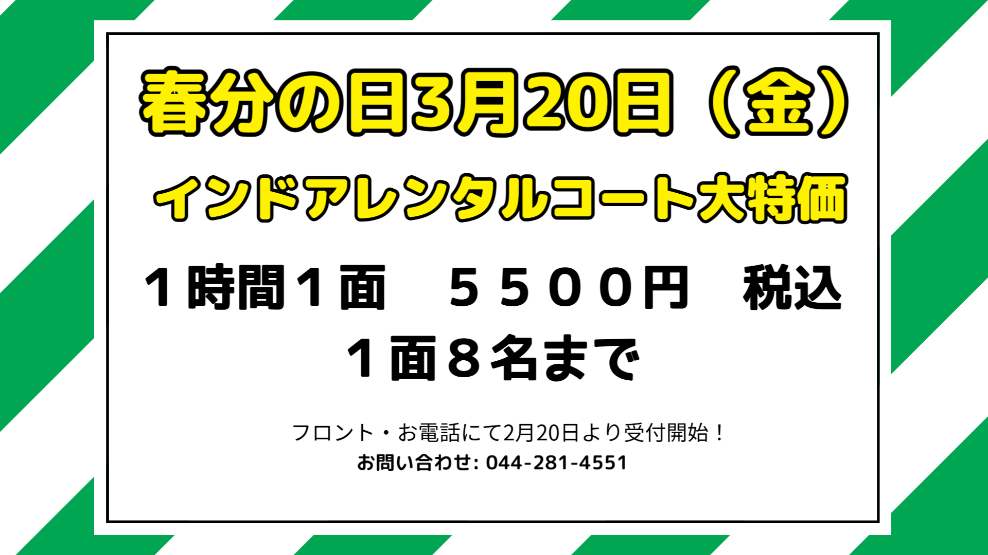 2月11日(水)インドアレンタル大解放! 2月11日(水)は、インドアコートを特別開放!天候に左右されず、快適な環境でテニスを楽しめる一日です。 1時間1面5500円(税込)割引価格で提供! 祝日はぜひ、インドアコートで …